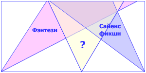 Изобразим на той же кривой область "сайнс фикшен". Базируется этот жанр на идеологии сциентизма и рационализма, так что противопоставление, дихтомия жанров действитель существует. На прямой. Но никак не в фазовой плоскости.